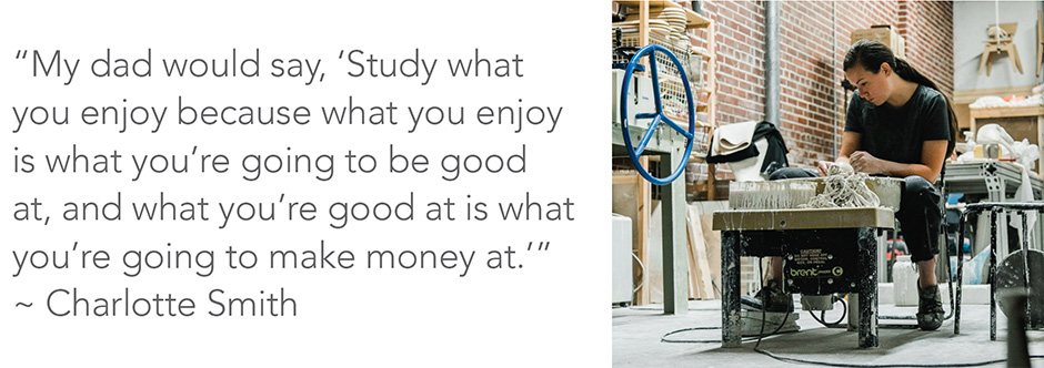 In addition to her wholesale ceramics business, Smith sells her wares directly to consumers through the Charlotte Smith Studios website. She also creates custom pieces, like light fixtures, large planters and vases, for individuals and design firms.