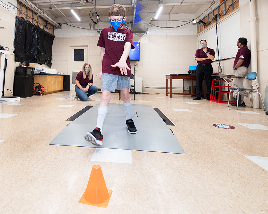 Local middle school student Cameron Knight walks across a surface in the Neuromechanics Lab, allowing his movement to be recorded in a motion capture system. One area of the lab’s research aims to improve motor skills in children.